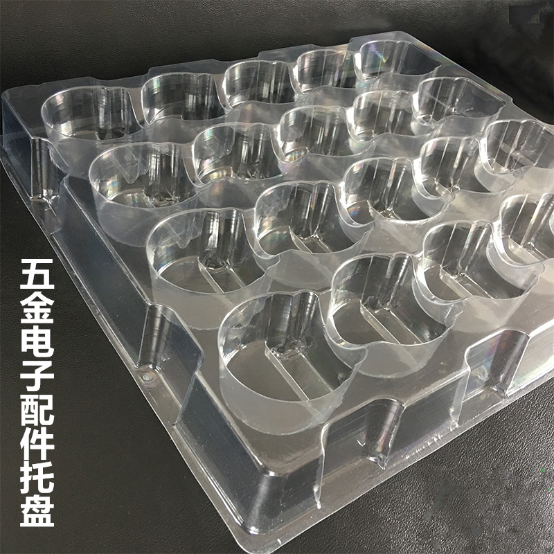 托盘:也叫塑料内托,采用吸塑工艺将塑料硬片制成特定凹槽的塑料,将产品置于凹槽内,起到?;ず兔阑返淖饔谩?br />